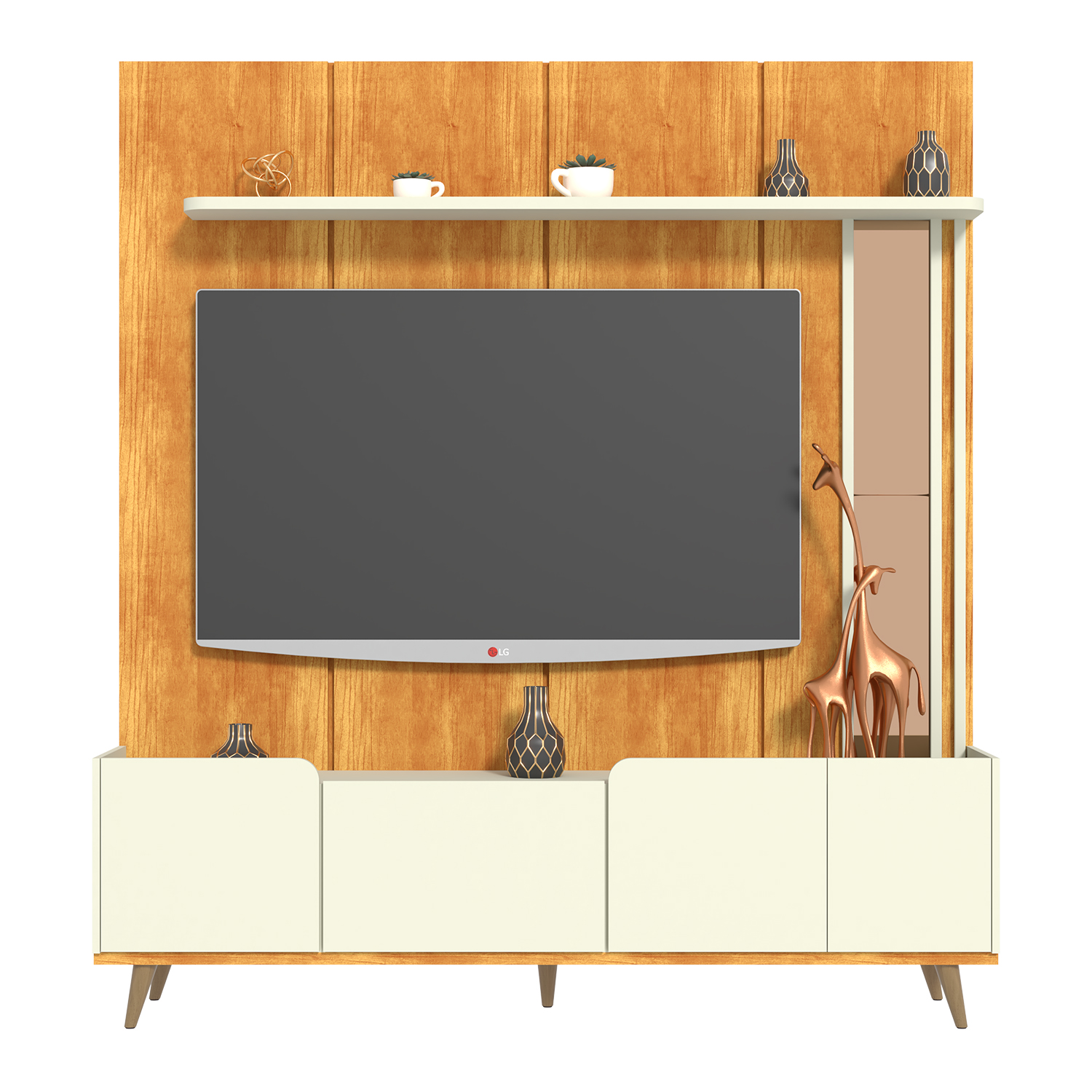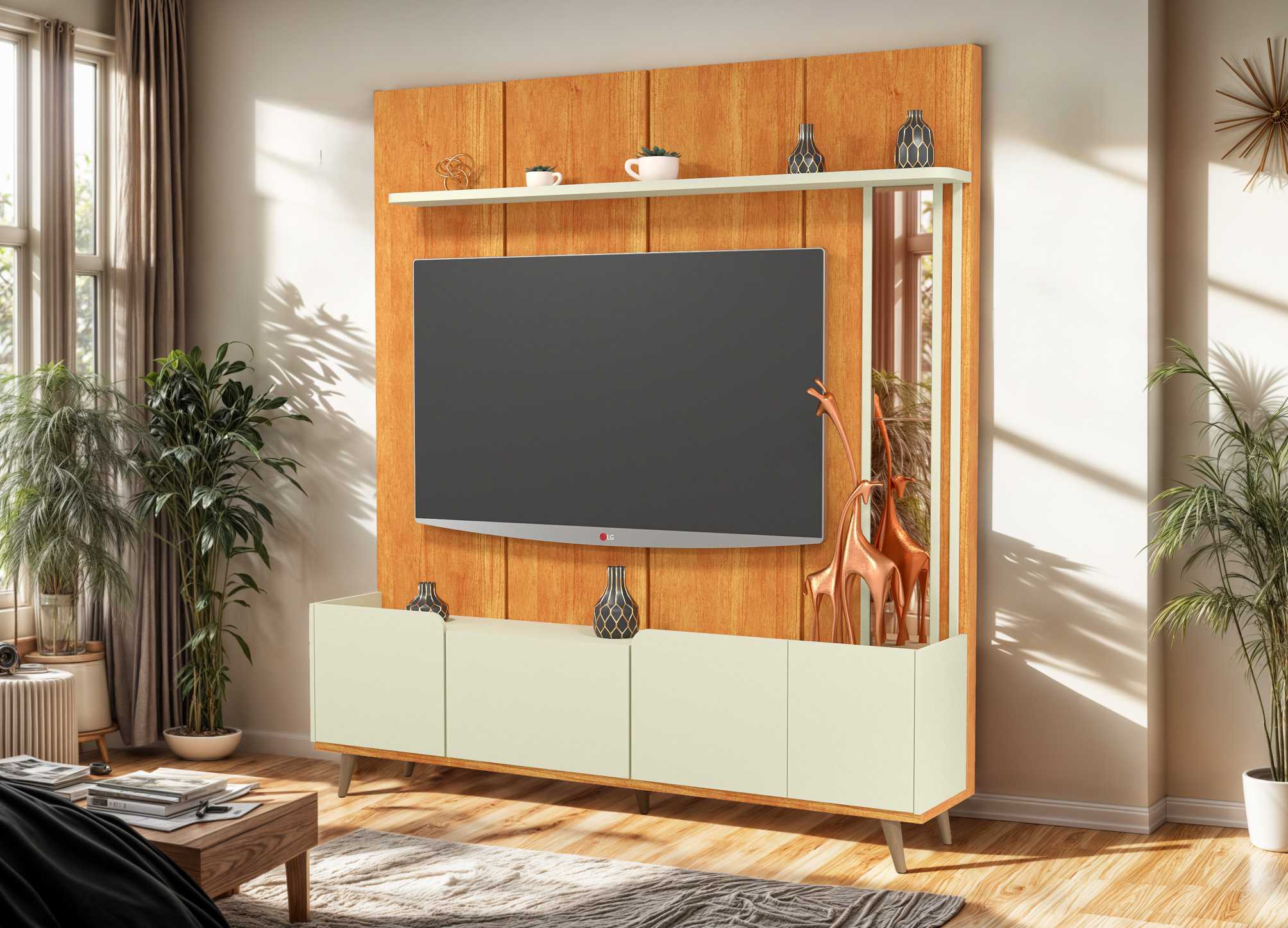 O Home Alaska é a escolha ideal para quem busca um móvel elegante, funcional e cheio de personalidade para a sala de estar. Com design contemporâneo, ele suporta TVs de até 65 polegadas e se destaca pelos seus charmosos pés cônicos de madeira, que trazem leveza e sofisticação ao ambiente. Suas portas com delicados detalhes curvos e o espelho aplicado na estrutura elevam o visual, criando um efeito moderno e acolhedor. O Home Alaska é mais do que um suporte para sua TV — é um elemento de destaque na decoração da sua casa.